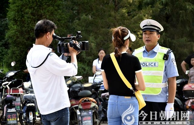 維護(hù)考場周邊交通秩序的警察接受媒體采訪
