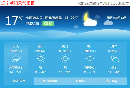 今天是2019年9月13日,星期五,農(nóng)歷八月十五,中秋節(jié)。遼寧朝陽小雨轉(zhuǎn)多云,氣溫14~22℃,西南風(fēng)3~5級(jí),空氣質(zhì)量?jī)?yōu)。日出時(shí)間:05:34;日落時(shí)間:18:14。(數(shù)據(jù)來源于中國氣象局2019年09月13日05時(shí)發(fā)布,請(qǐng)隨時(shí)關(guān)注天氣變化。)