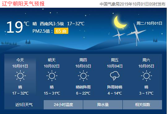 今天是2019年10月1日,星期二,農(nóng)歷九月初三。遼寧朝陽晴,氣溫17~32℃,西南風(fēng)3~5級,空氣質(zhì)量良好。日出時間:05:53;日落時間:17:43。(數(shù)據(jù)來源于中國氣象局2019年10月01日05時發(fā)布,請隨時關(guān)注天氣變化。)