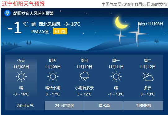 今天是2019年11月8日,星期五,農(nóng)歷十月十二。遼寧朝陽晴,氣溫-3~16℃,東南風(fēng)微風(fēng),空氣質(zhì)量良好。日出時(shí)間:06:36;日落時(shí)間:16:47。(中國氣象局2019年11月08日05時(shí)發(fā)布。)請隨時(shí)關(guān)注天氣變化。