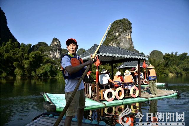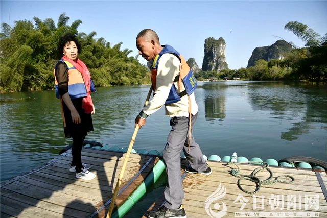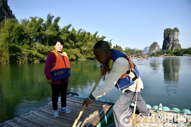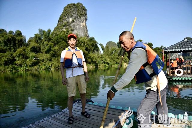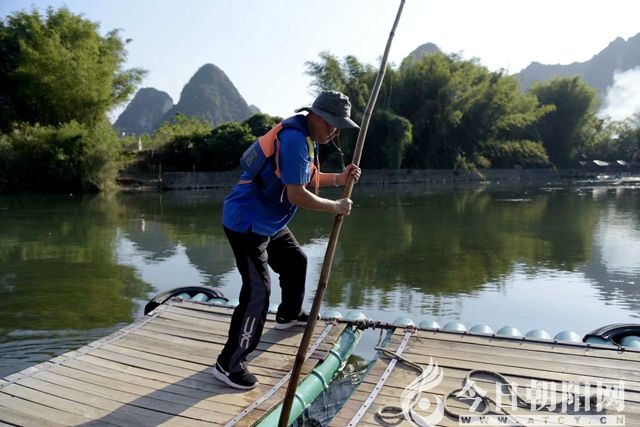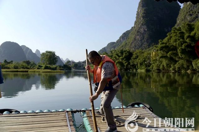 坐竹筏子很是有趣。第一件事就是要穿救生衣,艄工很嚴(yán)肅,不穿救生衣不讓上筏子。艄工留著長長的胡子,戴著斗笠,讓人望而生畏。我們一行12人,分作兩個(gè)筏子。我們坐好了,艄工只用一條竹竿,筏子在他的手中很輕松。剛走不遠(yuǎn),艄工就變了臉,不再嚴(yán)肅了,一臉的微笑,說:“歡迎各位乘坐我的筏子,大家邊看邊聽我的介紹。”雖然聲音很低沉,有磁性,但是很感人,艄工的解說讓漓江有了生命。