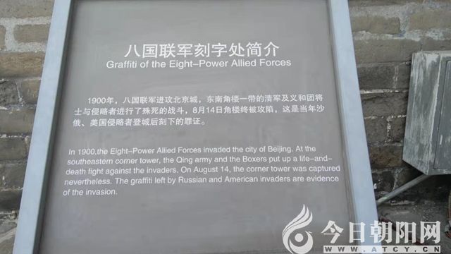 當時,東南角樓一帶的清軍和義和團將士與侵略者進行了殊死的搏斗,角樓被攻陷,沙俄、美國侵略者在角樓北墻上,以勝利者的姿態(tài)刻下了自己的名字,也把侵略者的丑陋嘴臉刻在了歷史的恥辱柱上。