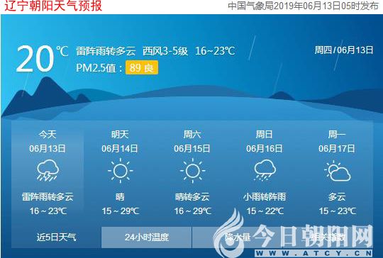 今天是2019年6月13日,星期四,農(nóng)歷五月十一。遼寧朝陽雷陣雨轉(zhuǎn)多云,氣溫16~23℃,西風(fēng)3~5級,空氣質(zhì)量良好。日出時間:04:24;日落時間:19:32。(數(shù)據(jù)來源于中國氣象局2019年06月13日5時發(fā)布,請隨時關(guān)注天氣變化)