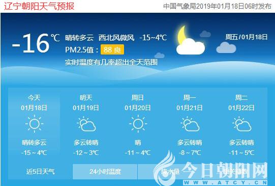 今天是2019年1月18日,星期五,農(nóng)歷臘月十三,“四九”第一天。遼寧朝陽晴轉(zhuǎn)多云,氣溫-15~4℃,西北風(fēng)3~5級,空氣質(zhì)量良好。日出時間:07:22;日落時間:16:55。