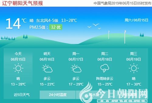 今天是2019年6月15日,星期六,農(nóng)歷五月十三。遼寧朝陽(yáng)晴,氣溫13~28℃,東北風(fēng)4~5級(jí),空氣質(zhì)量?jī)?yōu)。日出時(shí)間:04:23;日落時(shí)間:19:33。(數(shù)據(jù)來(lái)源于中國(guó)氣象局2019年06月15日5時(shí)發(fā)布,請(qǐng)隨時(shí)關(guān)注天氣變化)