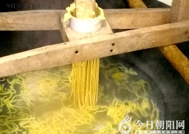 做饸饹用蕎面最好,但因蕎面緊缺,通常是用高粱面,再加適量的榆皮面(將老榆樹皮的內(nèi)層曬干后磨成的粉),以增強(qiáng)韌性和光滑度。壓饸饹的過程就和活塞在氣缸中工作時的形式類似。首先,將饸饹床子搭在已燒好開水的鍋沿上,然后把團(tuán)好的面團(tuán)從缸體底部的漏孔中擠出,直接落入滾開的水里,待水再開上來,只需十幾秒的時間就要撈出,煮的時間過長就容易化湯,影響口感。面團(tuán)一定要軟硬適中,太硬壓著費(fèi)勁,太軟壓出的饸饹條進(jìn)鍋后就會斷成疙豆了。