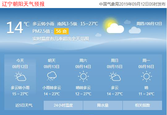 今天是2019年9月12日,星期四,農(nóng)歷八月十四。遼寧朝陽多云轉(zhuǎn)小雨,氣溫15~27℃,南風(fēng)3~5級,空氣質(zhì)量良好。日出時(shí)間:05:33;日落時(shí)間:18:15。(數(shù)據(jù)來源于中國氣象局2019年09月12日05時(shí)發(fā)布,請隨時(shí)關(guān)注天氣變化。)