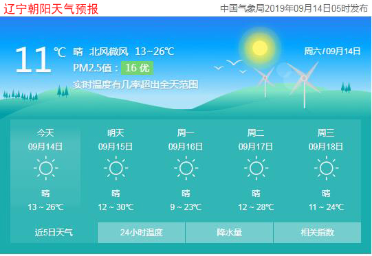 今天是2019年9月14日,星期六,農(nóng)歷八月十六。遼寧朝陽晴,氣溫13~26℃,北風微風,空氣質(zhì)量優(yōu)。日出時間:05:35;日落時間:18:12。(數(shù)據(jù)來源于中國氣象局2019年09月14日05時發(fā)布,請隨時關注天氣變化。)
