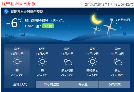 今天是2019年11月19日,星期二,農(nóng)歷十月二十三。遼寧朝陽晴,氣溫-10~2℃,西北風(fēng)4~5級(jí),空氣質(zhì)量優(yōu)。日出時(shí)間:06:50;日落時(shí)間:16:36。(中國氣象局2019年11月19日05時(shí)發(fā)布)請(qǐng)隨時(shí)關(guān)注天氣變化。
