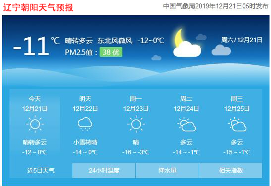 今天是2019年12月21日,星期六,農(nóng)歷十一月二十六。遼寧朝陽(yáng)晴轉(zhuǎn)多云,氣溫-12~0℃,西風(fēng)微風(fēng),空氣質(zhì)量?jī)?yōu)。日出時(shí)間:07:21;日落時(shí)間:16:31(中國(guó)氣象局2019年12月21日5時(shí)發(fā)布),請(qǐng)隨時(shí)關(guān)注天氣變化。