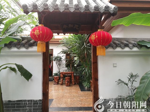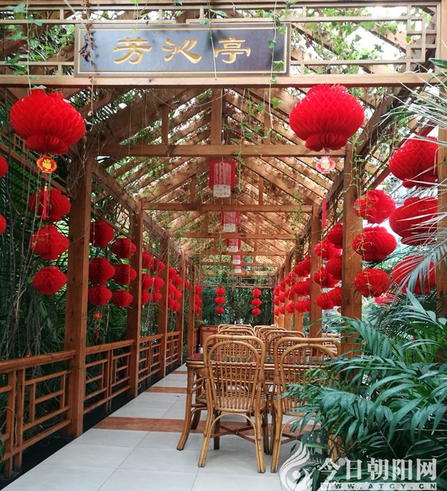 濃綠色如蒲扇般伸展的芭蕉樹葉,用它寬大的“手掌”遮擋著“濃烈”的日光。挺拔、俊秀的竹林一簇簇聚攏,緊湊地扎根于青瓦屋頂、紅漆木門與磚紅地板組合的院落里。淺褐色雕刻有花紋的木質圓桌與圓凳靜靜地駐立,敦實、厚重的模樣透出高雅和大氣的風格。在彰顯中國傳統(tǒng)文化博大精深氣勢的同時,襯托出古色古香的江南風味。竹桿交錯搭建而成的回廊檐角四周掛滿了紅艷艷的燈籠,與盛裝的游人交相輝映,裝扮出濃濃的節(jié)日氣氛。這就是坐落在天山腳下的小城——奎屯“大豐和生態(tài)園”。乍一看,以為是在南方古鎮(zhèn)的某一條青石板路街上呢。其實不然,適逢2019年大年初一,很多家庭聚集在此吃團圓飯,還有一場婚宴正在火熱地進行中。