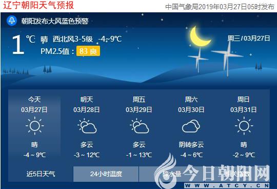 今天是2019年3月27日,星期三,農(nóng)歷二月二十一。遼寧朝陽(yáng)晴,氣溫-4~9℃,北風(fēng)4~5級(jí),空氣質(zhì)量良好。日出時(shí)間:05:53;日落時(shí)間:18:17。