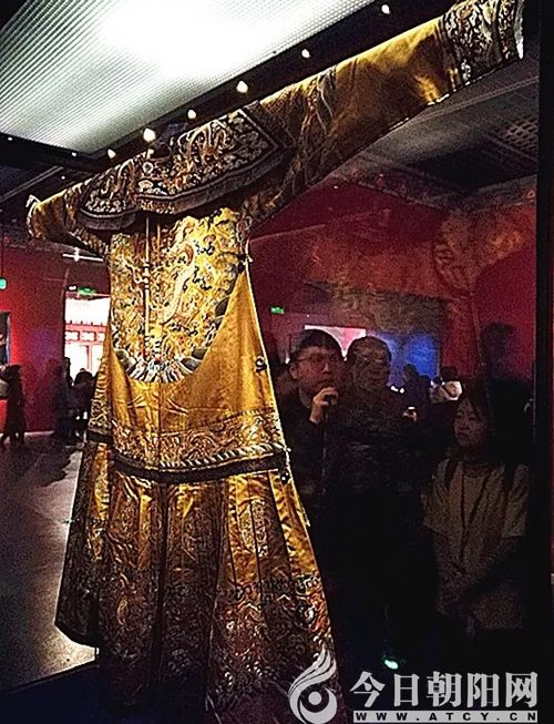 遼博展出的養(yǎng)心殿明黃色緞繡彩云金龍紋男夾朝袍,為清代皇帝的禮服之一,主要用于元旦、萬(wàn)壽、冬至三大圣節(jié),以及社稷壇、太廟、先農(nóng)壇、方澤壇等重大祭祀場(chǎng)合。此朝袍為乾隆皇帝御用之物。其式為:圓立領(lǐng),大襟右衽,左開(kāi)裾(jū),馬蹄袖、附披肩,團(tuán)龍雜寶織多邊緣,上衣下裳相連屬,下裳有襞(bì,衣服或某些器物上的褶zhě子)積,垂背云二。襯淺月白色暗花綾里,綴銅鎏金鏨花扣六枚。