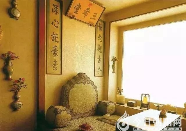 三希堂內(nèi)僅約四點八平方米,但陳設幽雅、古樸,彌補了空間的不足:狹長的室內(nèi)進深用楠木雕花隔扇隔分成南北兩間小室,里邊的一間利用窗臺擺設乾隆的御用文房用具。窗臺下,設置一鋪可坐可臥的高低炕,乾隆御座即設在高炕坐東面西的位置上。三希堂面積很小,卻大氣、肅穆,窗明幾凈,散溢著皇家的氣派與高雅。