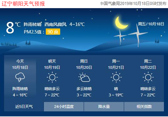 今天是2019年10月18日,星期五,農(nóng)歷九月二十。遼寧朝陽陣雨轉(zhuǎn)晴,氣溫4~16℃,東南風(fēng)3~5級(jí),空氣質(zhì)量良好。日出時(shí)間:06:11;日落時(shí)間:17:15。(中國氣象局2019年10月18日05時(shí)發(fā)布。)請(qǐng)隨時(shí)關(guān)注天氣變化。