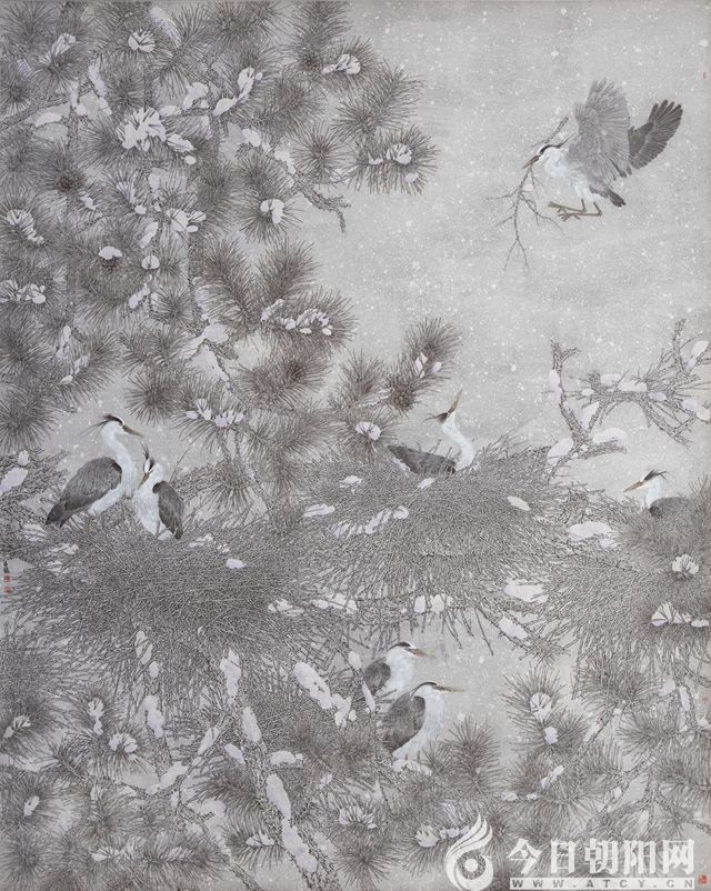 作品以傳統(tǒng)的瑞雪青松為創(chuàng)作主體,采用了雙勾設(shè)色的創(chuàng)新技法,以短而細(xì)的線勾勒松針,以豪放之筆寫出樹干,以沒骨之法寫瑞雪之形,再以白粉填色,墨線、墨塊與白粉相對(duì)應(yīng),渲染出冬日的氣氛,似寒氣逼人,蒼鷺與青松相互映襯,和諧自然,極富生活氣息。畫面?zhèn)鬟f出作者作畫時(shí)的平靜心情,不急不躁,功到而畫成,具有悠然脫俗的意境。整幅作品經(jīng)營(yíng)得當(dāng),疏密有序,渾厚質(zhì)樸,毫無嬌柔造作之感。