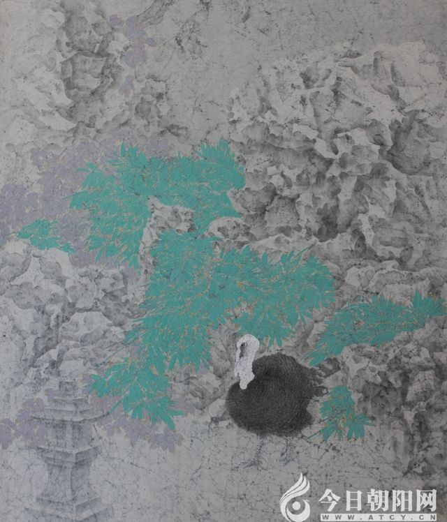 畫面解讀、創(chuàng)作立意:渾穆而深沉的太湖石、奇異而古樸的石燈、亭亭的翠竹……這些飽含中國(guó)古典文化內(nèi)涵的符號(hào),它們是對(duì)傳統(tǒng)的崇尚與堅(jiān)守。一只火雞神情呆滯、木訥,在神秘而莊嚴(yán)的氣氛中,顯得焦慮與不安。它徘徊,它踱步不前,似乎要逃離這“神秘之園”。畫面中,太湖石的冷灰色貫穿始終。配以點(diǎn)點(diǎn)的石綠,在平靜與深邃中,對(duì)比出無限的生機(jī)與活力……在對(duì)周遭變遷的反思中徘徊,在歷史和現(xiàn)實(shí)的臨界點(diǎn)上求索。我,只為那快意、通透的精神家園,那充滿生機(jī)與異趣的神秘之園。