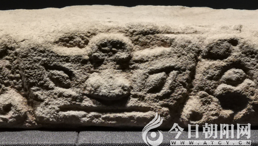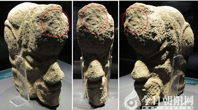 令人欣喜的是,筆者近日又有新的發(fā)現(xiàn):遼寧省博物館正在展出的紅山文化專題特展“又見(jiàn)紅山”中,有一件朝陽(yáng)半砬山紅山文化遺址出土的石雕人頭像,其額頭上竟也隱約刻有標(biāo)準(zhǔn)的菱形符號(hào),在特殊的角度拍攝,會(huì)明顯地顯現(xiàn)出來(lái),見(jiàn)下圖。這是所有饕餮紋額間菱形符號(hào)的真正祖源!