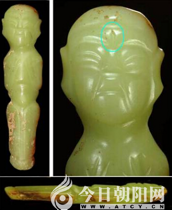 紅山文化時(shí)期的人物,額間多有孔洞裝飾,牛河梁遺址出土玉人及內(nèi)蒙古翁牛特旗巖畫(huà)人物額間都有孔洞裝飾。這種理念也應(yīng)該與興隆洼文化動(dòng)物額頭鉆孔的信仰理念有關(guān)聯(lián)。