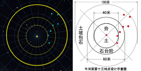 經(jīng)軟件Stellarium 0.13.2顯示,牛河梁遺址從整體建筑布局到局部地點(diǎn)設(shè)計(jì)都與北斗在四時(shí)八節(jié)的方位或北斗繞極運(yùn)行的軌道有關(guān)。尤其是牛河梁第13地點(diǎn)的祭天法壇,完全是按著當(dāng)時(shí)北斗繞極運(yùn)轉(zhuǎn)的軌道所設(shè)計(jì)建造的。建筑外圓、中圓和內(nèi)圓分別與天璇、天權(quán)和開(kāi)陽(yáng)三星的繞極軌跡吻合,從而使建筑的外環(huán)堆石帶和中環(huán)石臺(tái)階分別與斗魁四星和斗柄三星繞極旋轉(zhuǎn)的區(qū)域?qū)?yīng),內(nèi)圓夯土區(qū)與北斗內(nèi)星(開(kāi)陽(yáng))繞極旋轉(zhuǎn)的北極中心天區(qū)對(duì)應(yīng)。