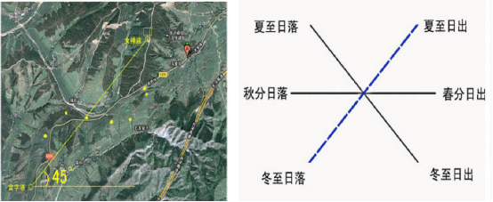 第一地點(diǎn)女神廟和第十三地點(diǎn)“金字塔”式建筑的連線是標(biāo)準(zhǔn)的“東北—西南”方向,與東西方向成45°角。這在整個(gè)遺址中可以作為一種“天文準(zhǔn)線”,表示古代天文學(xué)概念中“四維”中的“東北”與“西南”二維。《淮南子·天文訓(xùn)》中記載:“日冬至,日出東南維,入西南維;至春、秋分,日出東中,入西中。夏至出東北維,入西北維。至則正南。”東北維是夏至日出方位,西南維是冬至日落方位。此二維顯然可以構(gòu)成一年之中代表陰陽(yáng)盛極的兩個(gè)時(shí)間節(jié)點(diǎn)的方位坐標(biāo)。雖然這與實(shí)際觀測(cè)的牛河梁地區(qū)日出日落方位角度不符,但這種理想模式應(yīng)該是一種觀念上的東西,是為了正“四維”而確立的天文準(zhǔn)線。