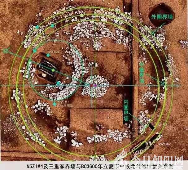 處在牛河梁遺址群核心的第五地點(diǎn),其東北側(cè)最高點(diǎn)的一號(hào)冢,完全是依據(jù)當(dāng)年立夏節(jié)的北斗天象所建造。我們將公元前3600年立夏節(jié)中候天文昏影終這一時(shí)刻的北斗天象圖疊加在第五地點(diǎn)一號(hào)冢俯視圖上,發(fā)現(xiàn)殘存的三重冢界墻分別與天璇、天樞、天璣三星繞極軌跡圓周吻合。而且北斗最亮星玉衡也剛好與中心大墓主人的頭部吻合,同時(shí)天極點(diǎn)也落在了中心石堆的中心附近(誤差大約0.8米)。