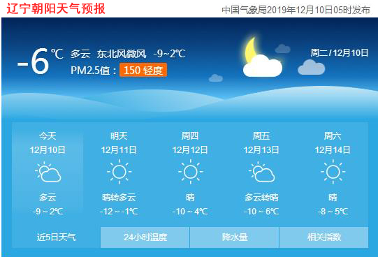 今天是2019年12月10日,星期二,農(nóng)歷十一月十五。遼寧朝陽多云,氣溫-9~2℃,東南風(fēng)微風(fēng),空氣質(zhì)量輕度污染。日出時(shí)間:07:12;日落時(shí)間:16:28(中國氣象局2019年12月10日5時(shí)發(fā)布),請(qǐng)隨時(shí)關(guān)注天氣變化。