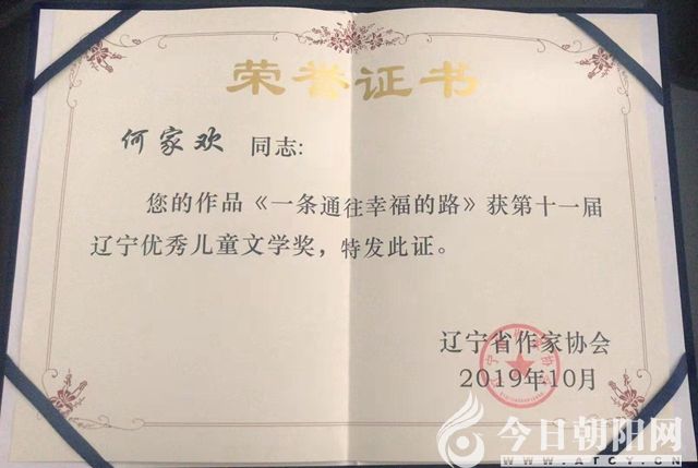 12月20日,一個好消息從遼寧沈陽傳來,朝陽籍女作家何家歡的童話作品《一條通往幸福的路》,在第十一屆遼寧優(yōu)秀兒童文學作品征集活動中脫穎而出,一舉斬獲“遼寧優(yōu)秀兒童文學獎”,并在當日召開的省作協(xié)十屆三次全委會上接受獎勵。