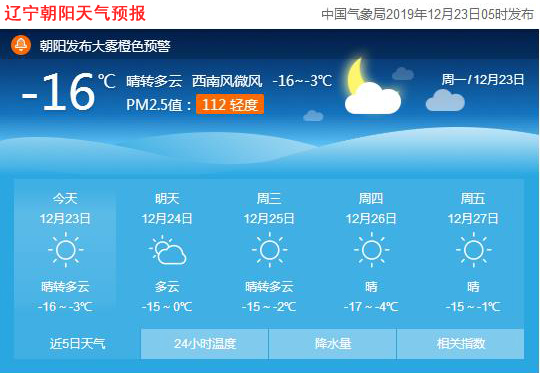 今天是2019年12月23日,星期一,農(nóng)歷十一月二十八,一九第二天。遼寧朝陽晴轉(zhuǎn)多云,氣溫-16~-3℃,東北風(fēng)3~5級(jí),空氣質(zhì)量輕度污染。日出時(shí)間:07:22;日落時(shí)間:16:32(中國(guó)氣象局2019年12月23日5時(shí)發(fā)布),請(qǐng)隨時(shí)關(guān)注天氣變化。