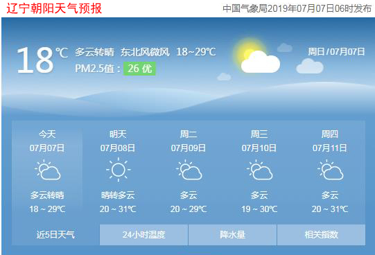 今天是2019年7月7日,星期日,農(nóng)歷六月初五。遼寧朝陽多云轉(zhuǎn)晴,氣溫18~29℃,東北風(fēng)微風(fēng),空氣質(zhì)量優(yōu)。日出時間:04:30;日落時間:19:35。(數(shù)據(jù)來源于中國氣象局2019年07月07日06時發(fā)布,請隨時關(guān)注天氣變化)