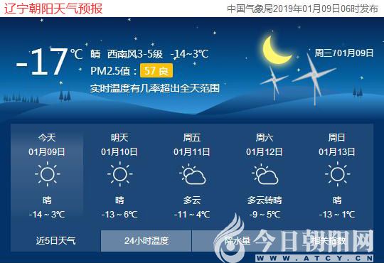 今天是2019年1月9日,星期三,農(nóng)歷臘月初四。遼寧朝陽(yáng)晴,氣溫-14~3℃,西南風(fēng)3~5級(jí)??諝赓|(zhì)量良好,日出時(shí)間:07:25;日落時(shí)間:16:45。