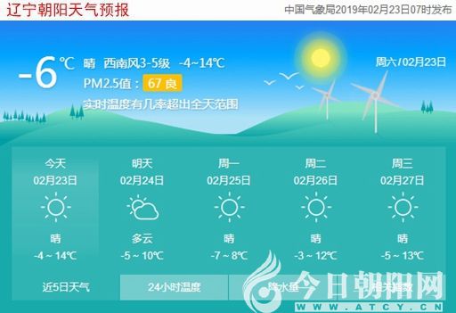 今天是2019年2月23日,星期六,農(nóng)歷正月十九,“八九”第一天。遼寧朝陽(yáng)晴,氣溫-4~14℃,西南風(fēng)3~5級(jí),空氣質(zhì)量良好。日出時(shí)間:06:45;日落時(shí)間:17:40。