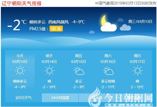 今天是2019年3月13日,星期三,農(nóng)歷二月初七。遼寧朝陽晴轉(zhuǎn)多云,氣溫-4~9℃,西北風(fēng)4~5級(jí),空氣質(zhì)量良好。日出時(shí)間:06:17;日落時(shí)間:18:01。