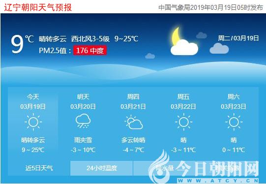 今天是2019年3月19日,星期二,農歷二月十三。遼寧朝陽晴轉多云,氣溫9~25℃,西南風4~5級,空氣質量中度污染。日出時間:06:07;日落時間:18:08。