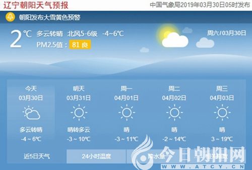 今天是2019年3月30日,星期六,農(nóng)歷二月二十四。遼寧朝陽(yáng)多云轉(zhuǎn)晴,氣溫-4~6℃,北風(fēng)5~6級(jí),空氣質(zhì)量良好。日出時(shí)間:05:48;日落時(shí)間:18:20。