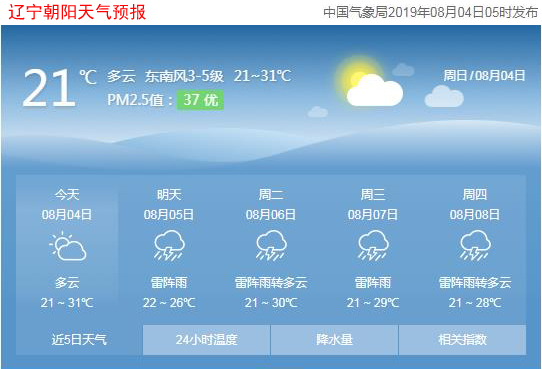 今天是2019年8月4日,星期日,農(nóng)歷七月初四,中伏第十四天。遼寧朝陽多云,氣溫21~31℃,東南風(fēng)3~5級,空氣質(zhì)量優(yōu)。日出時間:04:54;日落時間:19:14。(數(shù)據(jù)來源于中國氣象局2019年08月04日05時發(fā)布,請隨時關(guān)注天氣變化。)
