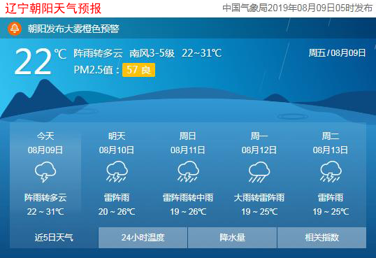 今天是2019年8月9日,星期五,農(nóng)歷七月初九,中伏第十九天。遼寧朝陽(yáng)陣雨多云,氣溫22~31℃,南風(fēng)3~5級(jí),空氣質(zhì)量良好。日出時(shí)間:04:59;日落時(shí)間:19:08。(數(shù)據(jù)來源于中國(guó)氣象局2019年08月09日05時(shí)發(fā)布,請(qǐng)隨時(shí)關(guān)注天氣變化。)
