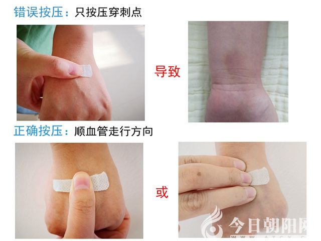 靜脈輸液作為一種快速有效的補(bǔ)液和給藥途徑,在疾病的搶救、治療和康復(fù)中占有重要地位。通常情況靜脈輸液時(shí),會(huì)有兩個(gè)針眼,一個(gè)在皮膚,一個(gè)在血管。所以輸液結(jié)束拔針后不能只按壓眼睛看到的皮膚針眼,而忽略了看不到的血管針眼。由于皮膚針眼和血管針眼不在一個(gè)點(diǎn)上,而放松按壓式即使皮膚針眼不在流血,但血管針眼處出血并不一定完全止住,又不容易被發(fā)現(xiàn),從而導(dǎo)致靜脈穿刺處發(fā)生淤青。那么,如何按壓針眼處才是正確的呢?小編在遼寧省朝陽(yáng)市中心醫(yī)院走廊的墻壁上看到了準(zhǔn)確答案,特意將照片和內(nèi)容拍攝下來,與大家分享。