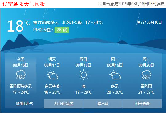 今天是2019年8月16日,星期五,農(nóng)歷七月十六,末伏第六天。遼寧朝陽雷陣雨轉(zhuǎn)多云,氣溫17~24℃,北風(fēng)3~5級,空氣質(zhì)量優(yōu)。日出時(shí)間:05:06;日落時(shí)間:18:58。(數(shù)據(jù)來源于中國氣象局2019年08月16日05時(shí)發(fā)布,請隨時(shí)關(guān)注天氣變化。)