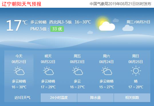 今天是2019年8月21日,星期三,農歷七月二十一。遼寧朝陽多云轉晴,氣溫16~30℃,西北風3~5級,空氣質量優(yōu)。日出時間:05:11;日落時間:18:51。(數(shù)據(jù)來源于中國氣象局2019年08月21日05時發(fā)布,請隨時關注天氣變化。)