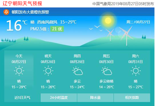 今天是2019年8月27日,星期二,農(nóng)歷七月二十七。遼寧朝陽晴,氣溫15~29℃,西南風(fēng)微風(fēng),空氣質(zhì)量優(yōu)。日出時間:05:17;日落時間:18:42。(數(shù)據(jù)來源于中國氣象局2019年08月27日05時發(fā)布,請隨時關(guān)注天氣變化。)