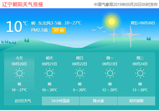 今天是2019年9月20日,星期五,農(nóng)歷八月二十二。遼寧朝陽晴,氣溫10~27℃,東北風(fēng)3~5級,空氣質(zhì)量良好。日出時(shí)間:05:41;日落時(shí)間:18:01。(數(shù)據(jù)來源于中國氣象局2019年09月20日05時(shí)發(fā)布,請隨時(shí)關(guān)注天氣變化。)