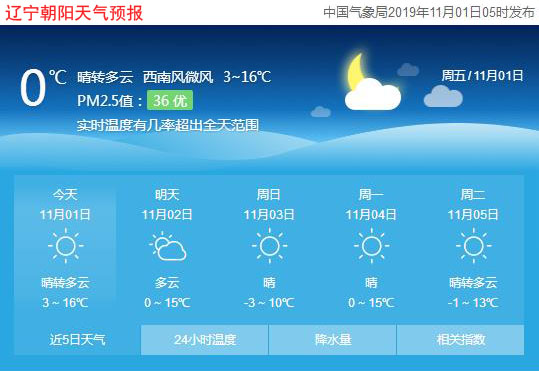 今天是2019年11月1日,星期五,農(nóng)歷十月初五。遼寧朝陽晴轉(zhuǎn)多云,氣溫3~15℃,東南風(fēng)微風(fēng),空氣質(zhì)量優(yōu)。日出時間:06:28;日落時間:16:55。(中國氣象局2019年11月01日05時發(fā)布。)請隨時關(guān)注天氣變化。