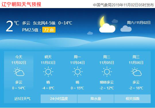 今天是2019年11月2日,星期六,農(nóng)歷十月初六。遼寧朝陽多云,氣溫0~14℃,西北風3~5級,空氣質(zhì)量良好。日出時間:06:29;日落時間:16:54。(中國氣象局2019年11月02日05時發(fā)布。)請隨時關(guān)注天氣變化。