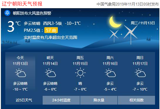 今天是2019年11月13日,星期三,農(nóng)歷十月十七。遼寧朝陽多云轉(zhuǎn)晴,氣溫-10~1℃,北風(fēng)5~6級,空氣質(zhì)量良好。日出時間:06:42;日落時間:16:41。(中國氣象局2019年11月13日05時發(fā)布。)請隨時關(guān)注天氣變化。