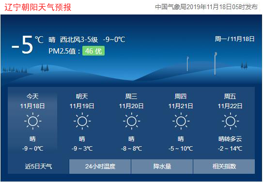 今天是2019年11月18日,星期一,農(nóng)歷十月二十二。遼寧朝陽晴,氣溫-9~0℃,西北風(fēng)4~5級,空氣質(zhì)量優(yōu)。日出時(shí)間:06:48;日落時(shí)間:16:37。(中國氣象局2019年11月18日05時(shí)發(fā)布)請隨時(shí)關(guān)注天氣變化。
