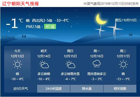 今天是2019年12月13日,星期五,農(nóng)歷十一月十八。遼寧朝陽晴,氣溫-10~4℃,西北風(fēng)4~5級,空氣質(zhì)量優(yōu)。日出時(shí)間:07:15;日落時(shí)間:16:28(中國氣象局2019年12月13日5時(shí)發(fā)布),請隨時(shí)關(guān)注天氣變化。
