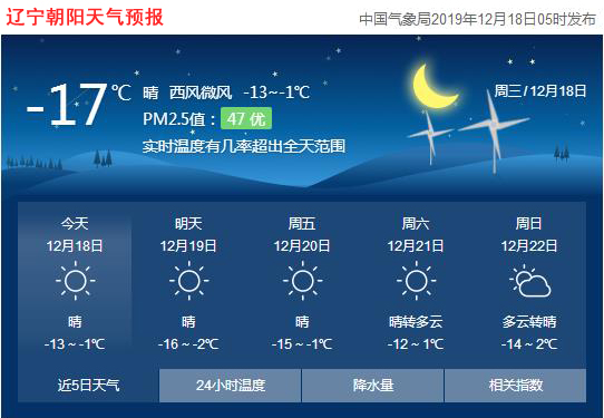 今天是2019年12月18日,星期三,農(nóng)歷十一月二十三。遼寧朝陽晴,氣溫-13~-1℃,西南風微風,空氣質(zhì)量優(yōu)。日出時間:07:19;日落時間:16:29(中國氣象局2019年12月18日5時發(fā)布),請隨時關(guān)注天氣變化。