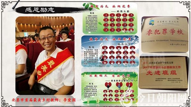 班級文化是校園文化的重要組成部分,也是形成班級凝聚力,提高學(xué)生自信心、自豪感和創(chuàng)新精神的有效途徑。為了進(jìn)一步營造校園文化氛圍,加強(qiáng)班級文化建設(shè),發(fā)揮環(huán)境育人的熏陶作用,結(jié)合我校的“感恩特色教育”,分別確定幼兒園主題為“文明從我做起”;小學(xué)部主題為“感恩從現(xiàn)在開始”;中學(xué)部主題為“夢想在這里起航”,各學(xué)段、各班級獨具特色,異彩紛呈,真正做到了讓“每一面墻”都成為“無聲的導(dǎo)師”。自2017年開始,全校已經(jīng)推廣使用了“幼兒園感恩認(rèn)識篇——文明禮儀課程、小學(xué)部感恩領(lǐng)悟篇——感恩立德課程、中學(xué)部感恩行動篇——立志成材課程的校本教材。每周一節(jié)課,由班主任親自任教。該套教材被評為“朝陽市德育校本課程優(yōu)秀獎”。通過一系列人文德育修養(yǎng)課程的實施,使廣大師生心靈得到了洗禮,思想道德素質(zhì)得到升華,涌現(xiàn)出了以李愛國老師為代表的北票最美鄉(xiāng)村教師和感恩之星、勵志少年,師生互相學(xué)習(xí),互相鼓勵,不斷進(jìn)步,形成了良好的校風(fēng)和班風(fēng)。2017年我校被評為“全國零犯罪學(xué)校”“朝陽市思想道德建設(shè)先進(jìn)班組”,彰顯了道德教育的力量。