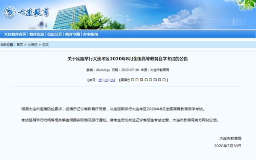 關(guān)于延期舉行大連考區(qū)2020年8月全國高等教育自學(xué)考試的公告